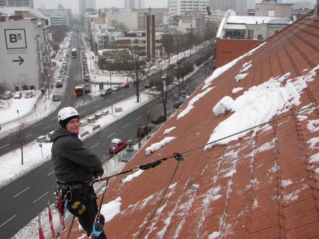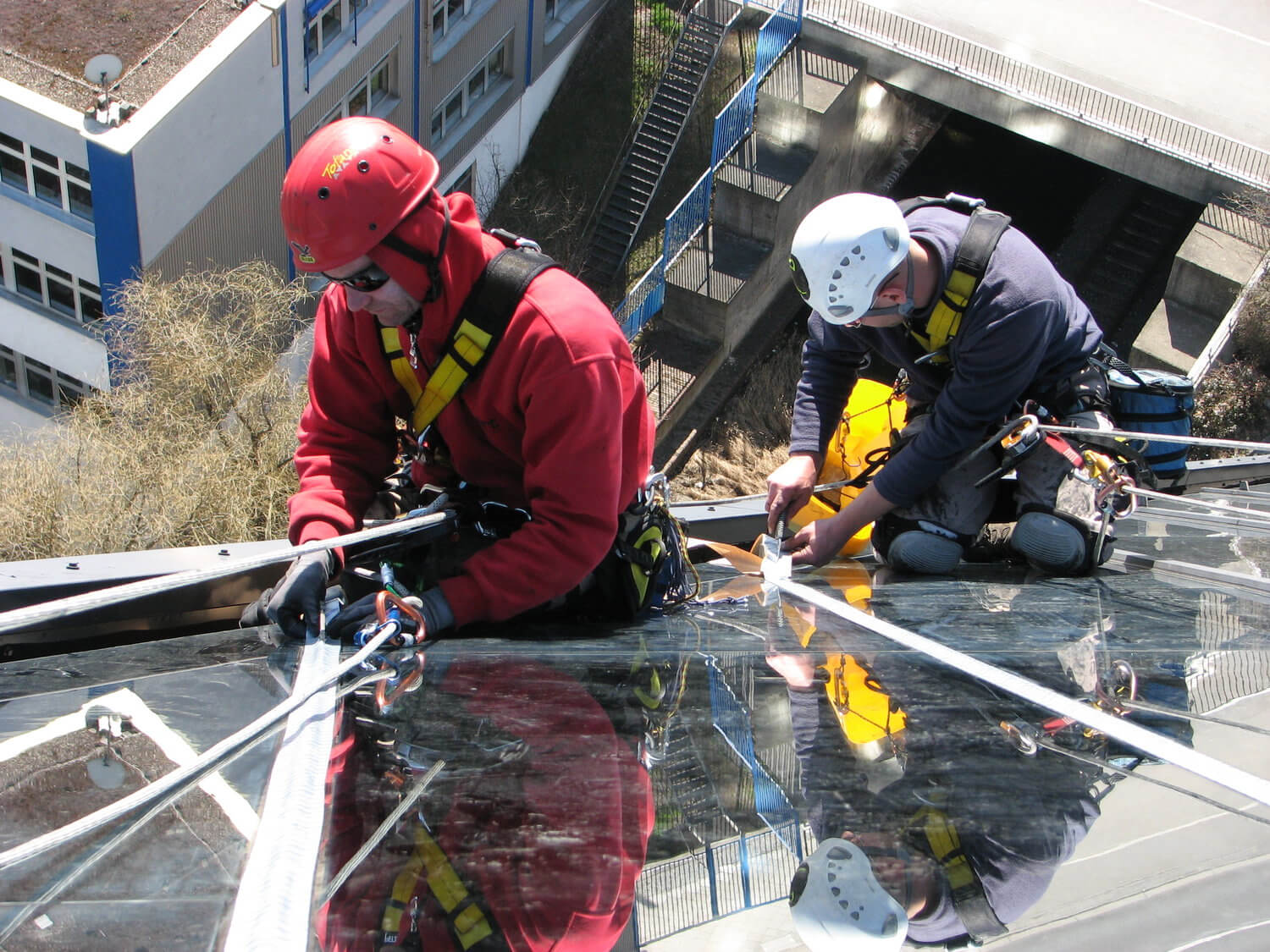 Unsere Industriekletterer sind spezialisiert auf Arbeiten an schwer zugänglichen Außenflächen. Auf Dächern und an Fassaden übernehmen wir u. a. Sanierungen, Eindeckungen, Reparaturen sowie Reinigungs- und Sicherungsarbeiten.